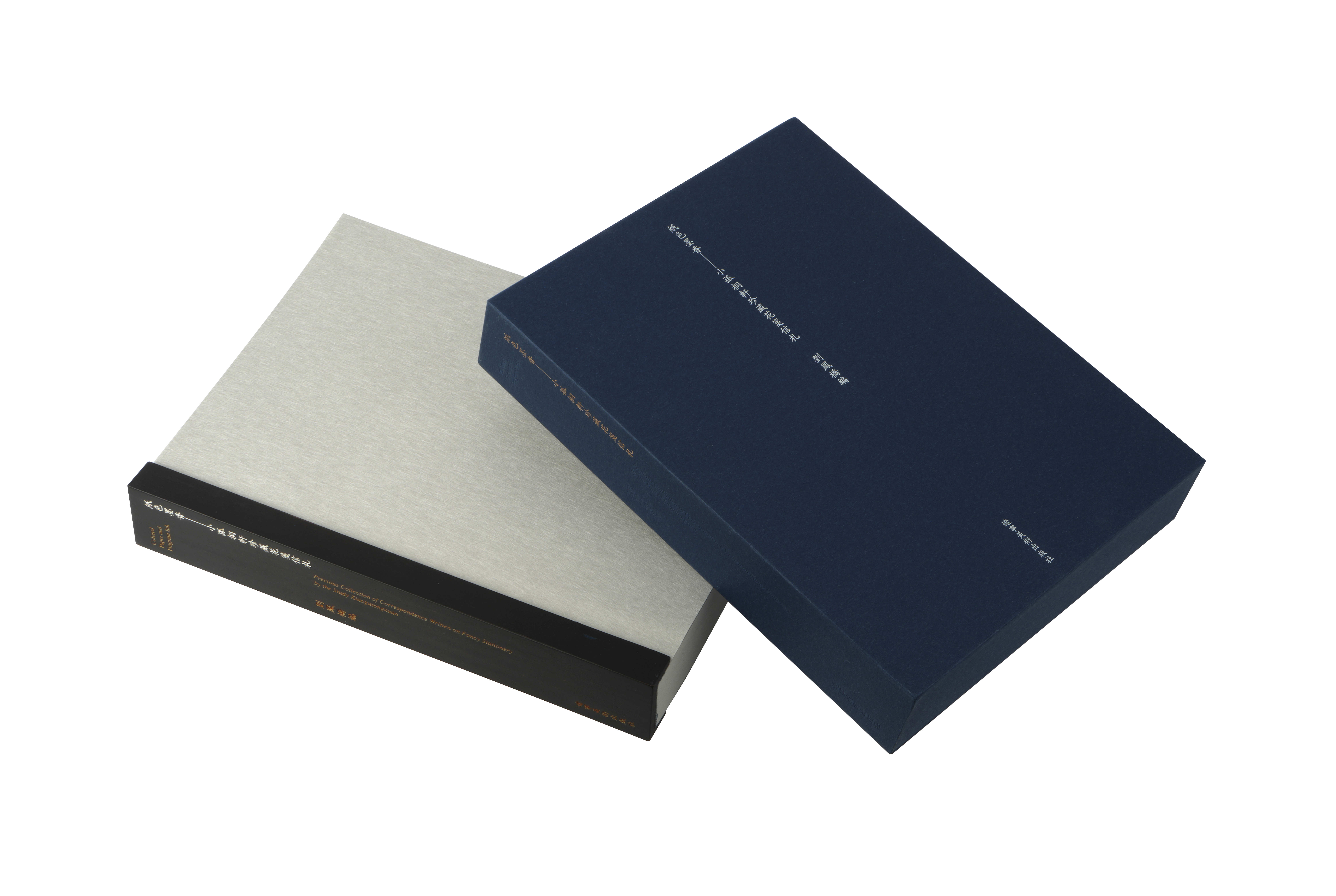 - 此書為假精裝書+木頭書脊卡座配書匣形式,結構比較獨特,書 匣面紙有燙白、燙金、不印壓凹工藝;書脊實木卡座為鐳射雕刻 文字後手工填色,配合書脊紙前後波浪形切邊,整本十分獨特。