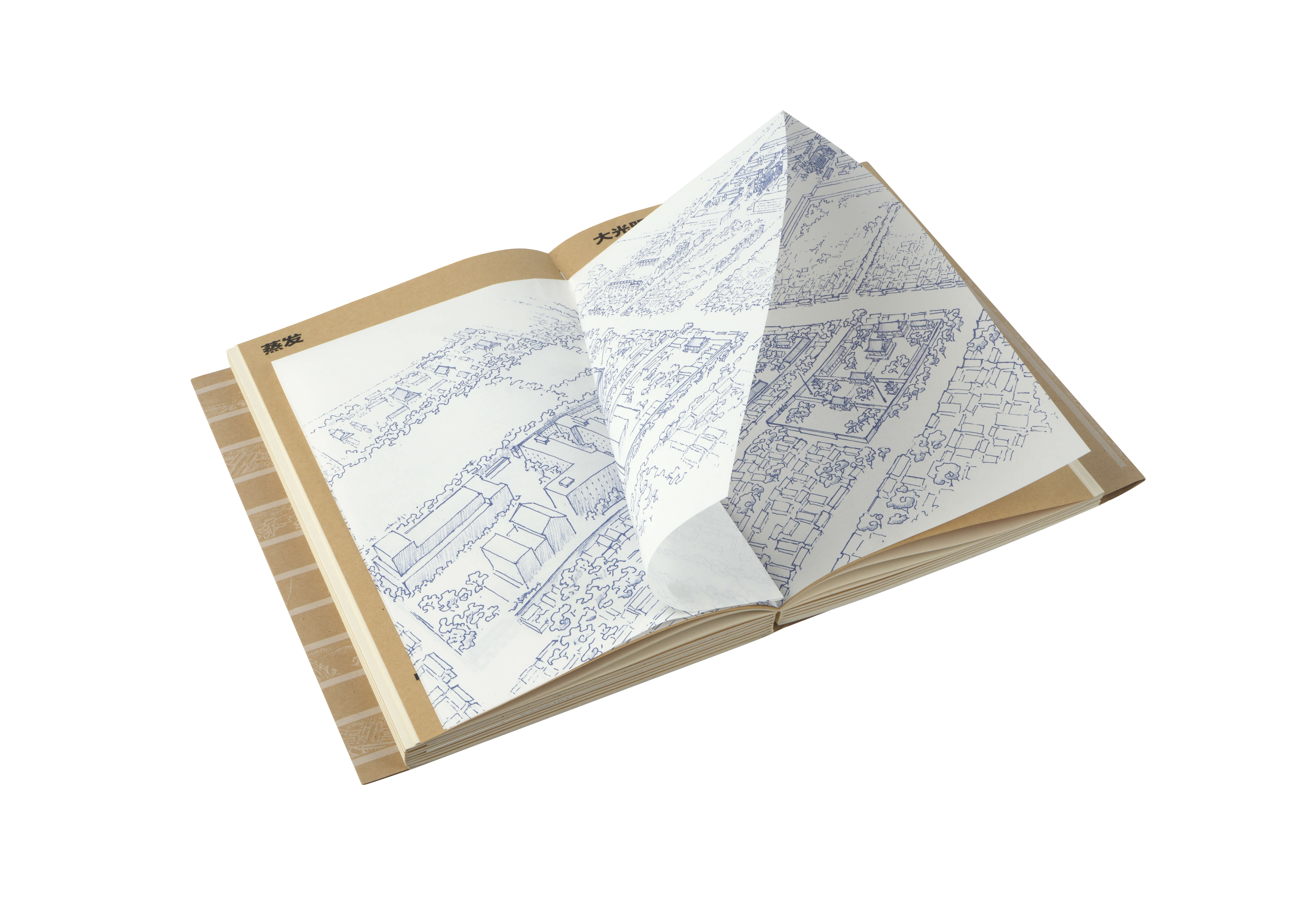 此書以北京建都八百年為設計起點,拿起此書它獨特的腰封映入 眼簾,拆開護封,一本乾乾淨淨的米白色裸脊裝展示出來,燙印 與壓凹工藝結合出城市的更迭;特別的是它的每一章節用四頁黃頁牛皮套一個輕薄的手帳紙拉開,翻開每一個拉頁就翻開語言重構了歷史與城市的對話。