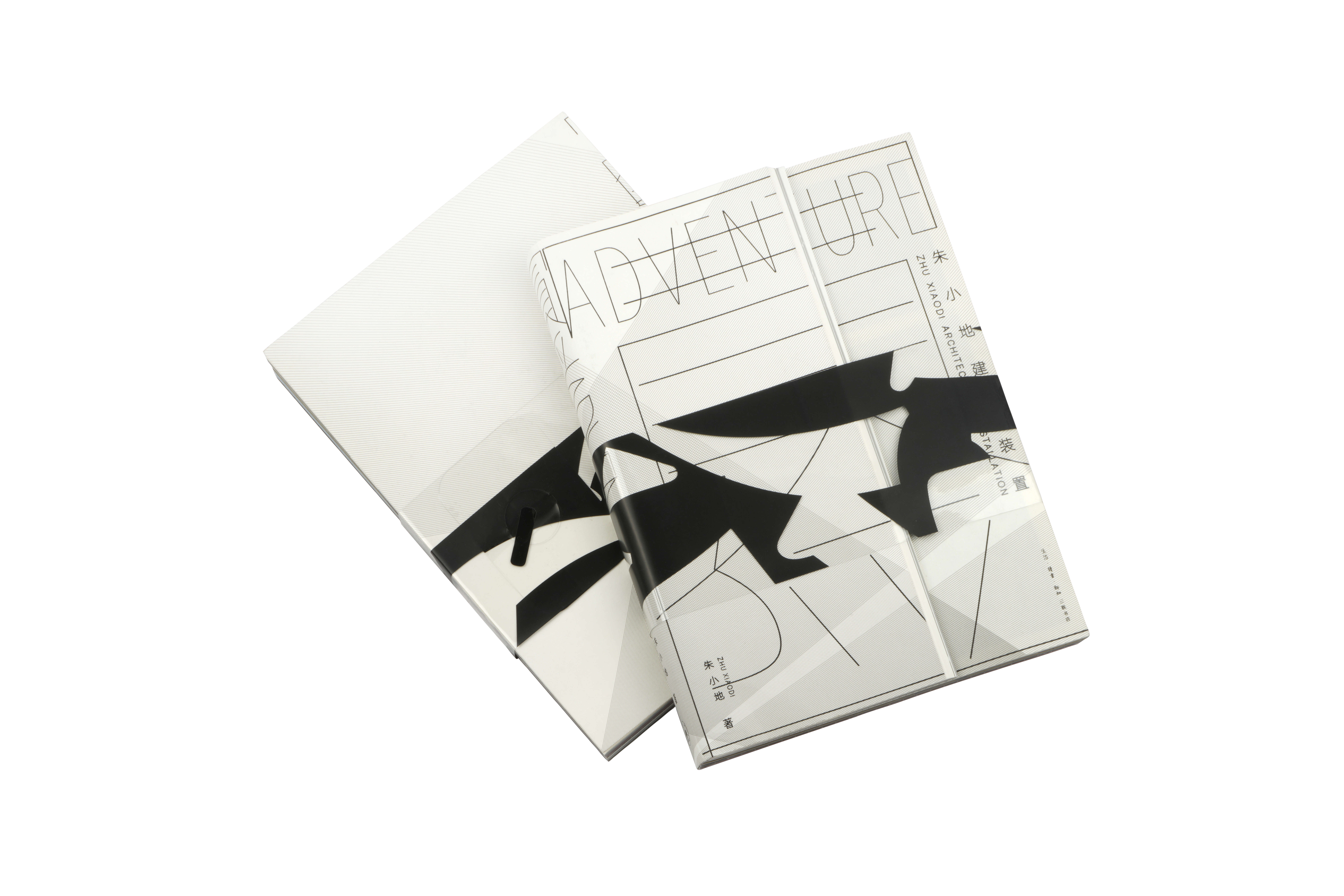 此書的設計由透明的腰封,粘裱的穿線小冊子和通裱的裸脊裝配 成;突出的是其內文由多款印刷難度大的多種紙張構成,如鏡面 卡紙、PVC等,內文結合一些uv、磨砂uv,一同模擬建築 裝置在空間的層疊感,引導視線,創造動態的閱讀體驗。