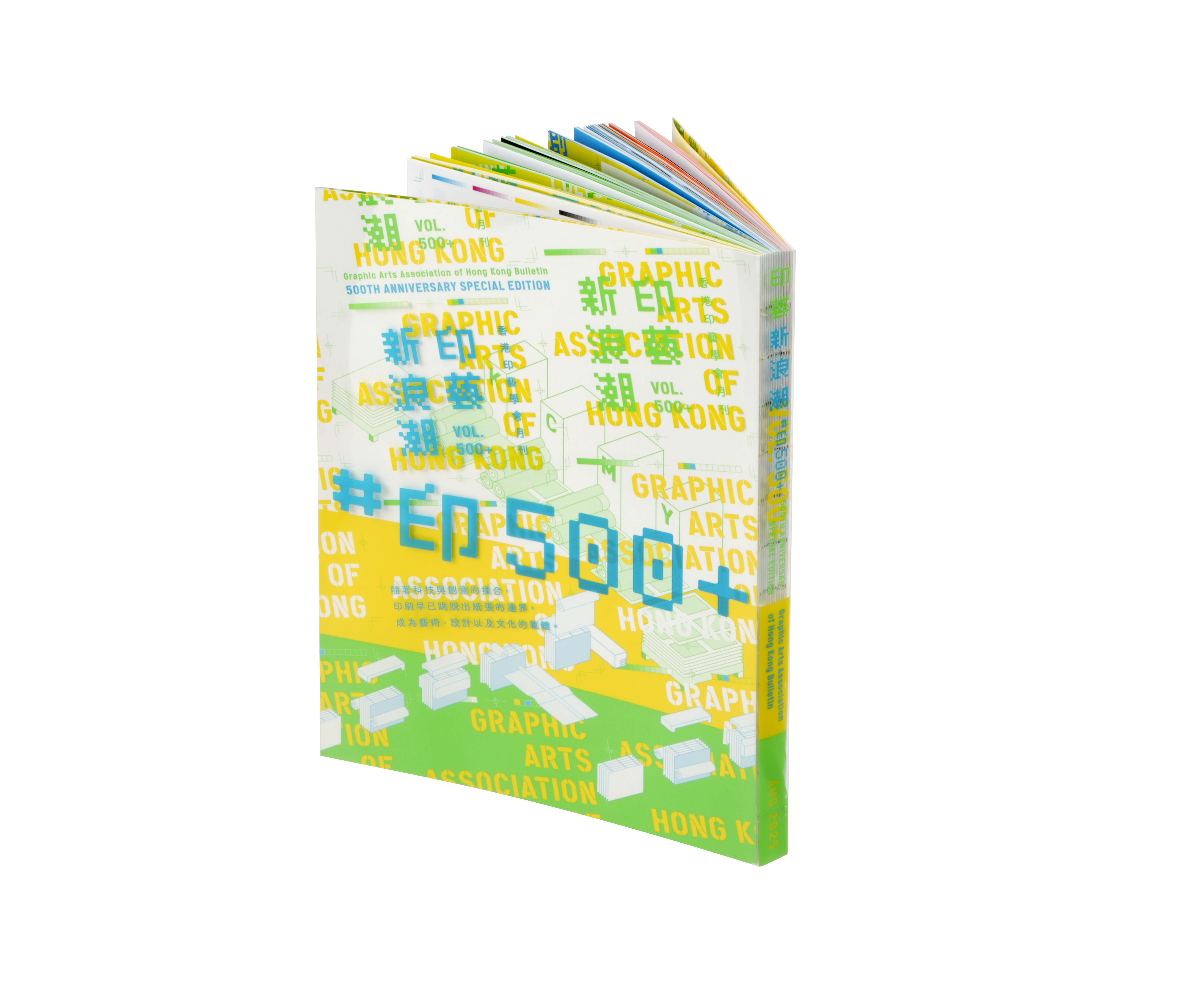 《香港印藝學會月刊500期特刊 #印500+》的主題是「 印藝新浪潮」,不僅是對第500期的里程碑致敬,更是一場面 向未來的創意實驗,掀開印藝新篇章。此特刊的設計以「新浪潮 」為核心概念,展現嶄新、Fresh、現代與玩味的特質。以「新」及「浪潮」作為主軸,設計師選取了鮮嫩水潤的色彩,用 上主色的螢光綠、螢光藍,加上100%黃色、螢光湖水綠、螢 光橙等,讓整體視覺效果充滿活力,設計傳達出青春氣息。 封面上的標題中文字體設計是Pixel像素風格,強調像素(Resolution)在印刷圖像中的重要性,展現現代有趣 的風格。英文字體「Cargo」以Stencil(模板透空 )的形式呈現,呼應了印刷工藝中採用模板進行特殊效果(Sp eical Effect)的過程,增添了工業風格的細緻感 。中、英文特刊名字,加上印刷的出血線,重複又重複,就像印 刷一樣,一張紙重複印同一個圖案。 此特刊的護封(Jac ket)運用了膠片材質,呼應新浪潮的理念,滑亮的質感,加 上反光,仿若波光粼粼的的水潤效果。護封與內封面搭配了現代 感十足的單線插畫,展現出多樣的印刷、製作、空間、書店等等 的場景與作業,讓讀者感受到印刷的奇妙旅程。 此特刊共四 章,每章扉頁設計延續了封面所用的字體設計及單線插圖。 每章 分別用不同的螢光色,不同的單線插圖,包括不同的印刷種類、 書店、製書步驟、藝術空間等也印在每個扉頁中間的半透明牛油 紙上,那透透的感覺,顯示一種模糊的效果,看到與看不到之間 ,也疊上扉頁上,呈現不同的感覺。