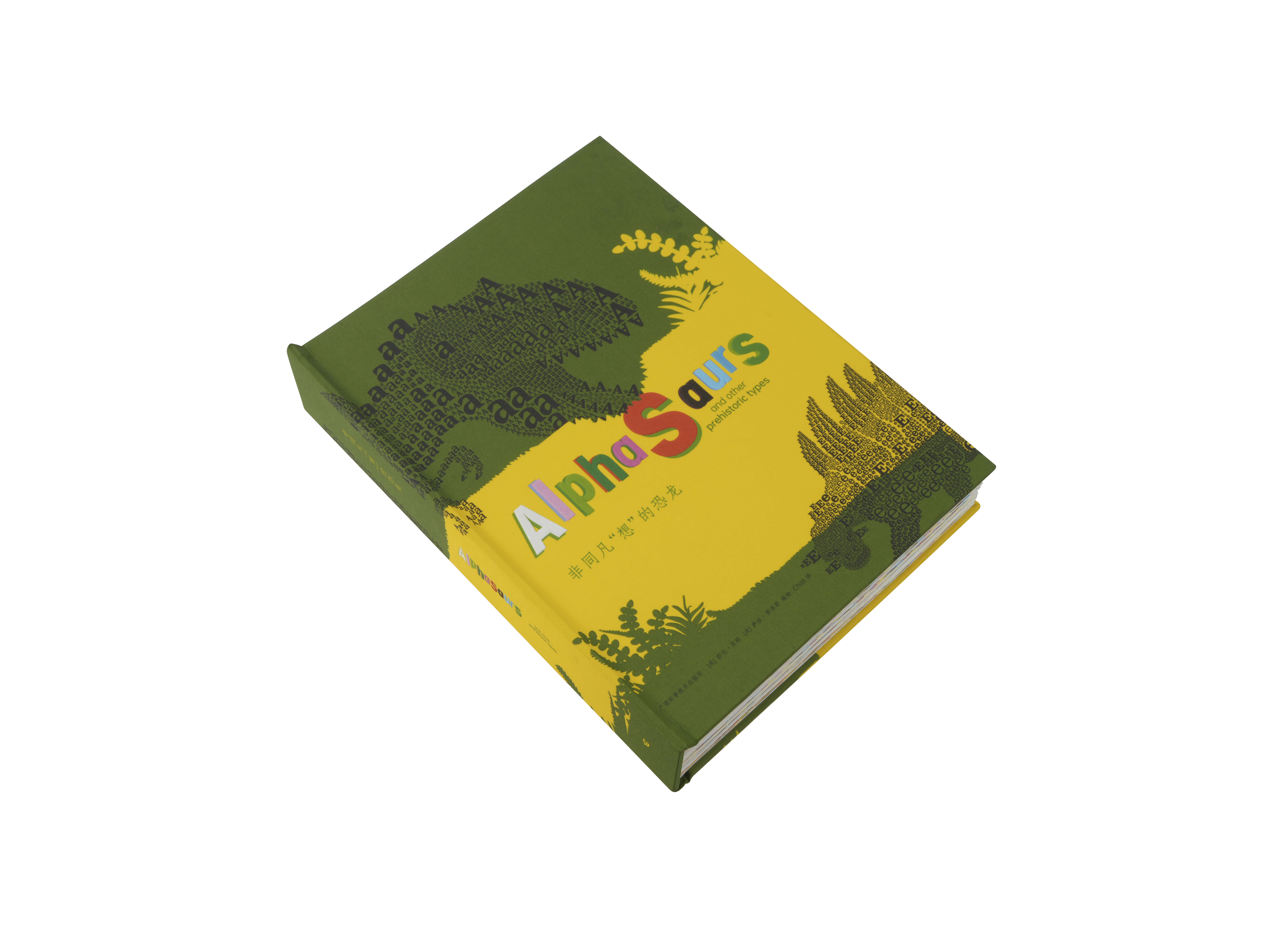 此書為方脊精裝卡冊書,兒童讀物,全書均以環保材料製作(包 含皮殼布料、灰板、內文紙張、膠水等等),歷時半年最終成書 。封面以及內文每頁均有大幅面恐龍圖案或腳印壓凹效果,滿足 小朋友閱讀之外,還增加了凹凸的觸覺效果,每個壓凹圖案都凹 到極致,力透紙背,作者意圖用這種方式,來展現恐龍的強大和 力量感,同時,設計師也兼顧中英文閱讀,依次寫《母字》有恐龍的強大與字母“A 字”一個對應的恐龍名稱,極具趣味性。