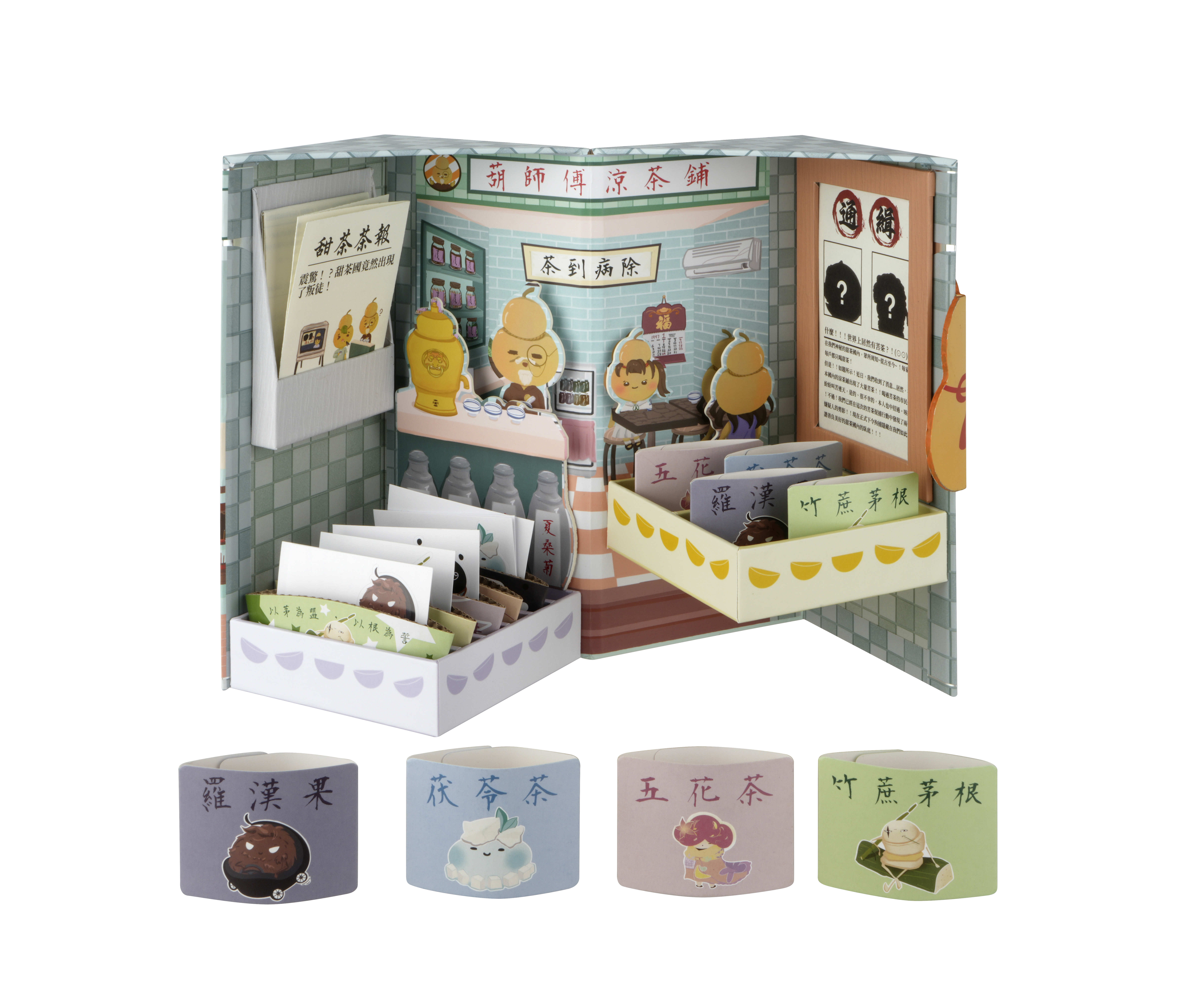 - 葫記涼茶包裝盒以涼茶文化為核心設計理念,採用斜角開啟結構 ,盒身中部特意設計葫蘆形凸起,既呼應品牌名稱中的「葫」字 ,又成為涼茶舖的標誌性視覺符號。 打開包裝後,內部分設 兩個獨立收納區,分別用於放置涼茶杯套與茶包,收納有序且便 於取用。左側區域模擬報紙架造型,搭配一份精心設計的《甜茶 日報》,以生動淺顯的內容向讀者科普「多數涼茶其實帶甜味」 的知識,溫和消解大眾對涼茶的苦味恐懼。與此同時,左側區域 還設有可直接觀看的「通緝令」圖案,以趣味化表達「通緝苦味 涼茶」,通過反覆強調加深讀者對「涼茶可甜」的記憶點,讓傳 統涼茶文化以更親近的方式走進大眾生活。 外包裝的圖案融 合中西建築元素,表面特意採用燙亮銀工藝與絲印UV技術,通 過金屬光澤與立體肌理的碰撞,大幅提升包裝的觀賞性與精緻質 感。包裝內部的葫蘆造型及涼茶舖場景採用立體書工藝呈現—— 打開後,葫師傅、涼茶、顧客與葫蘆等主體元素皆以立體凸起形 式呈現,如同微型場景生動還原