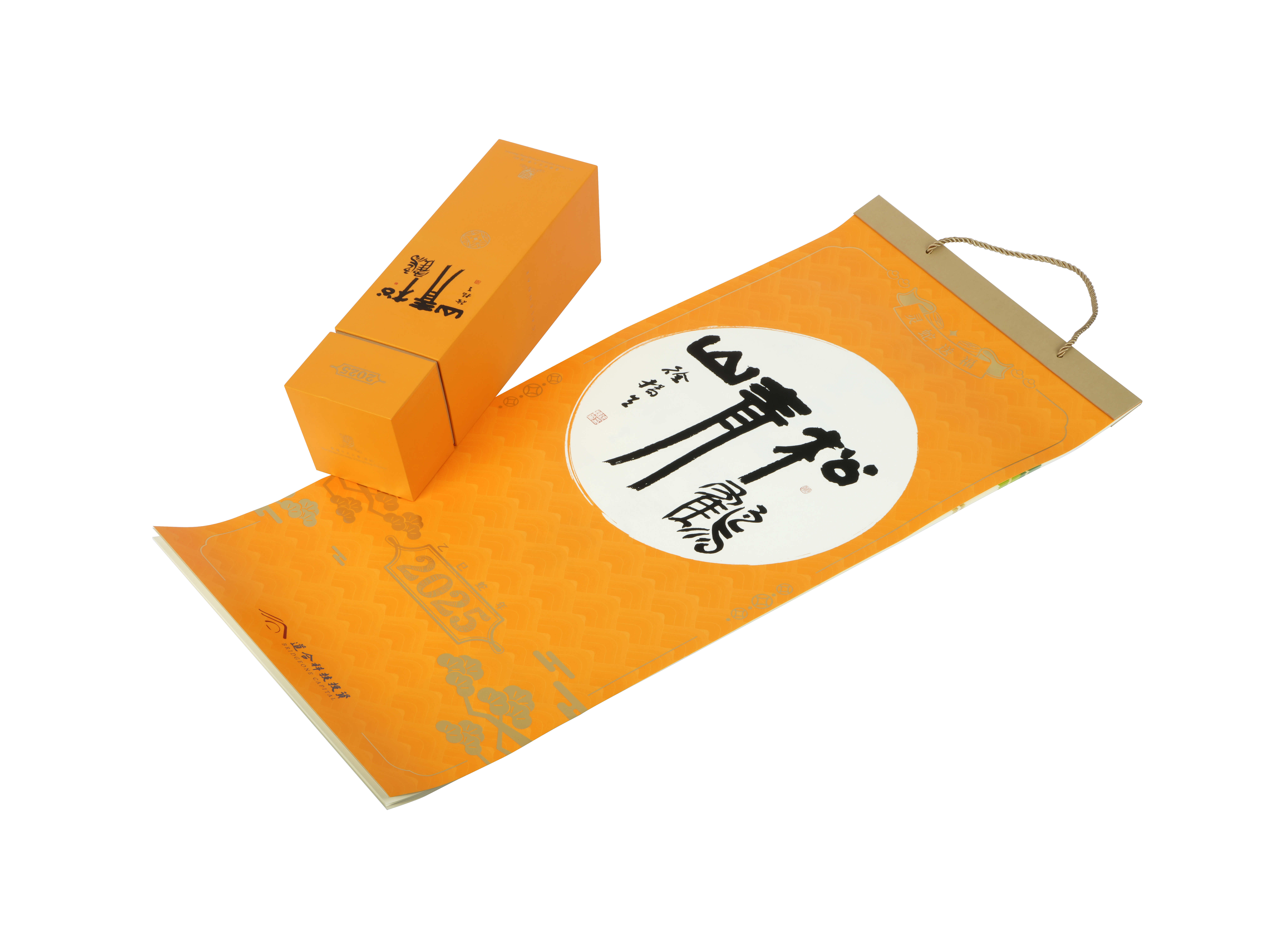 直筒式掛曆盒,專黃印刷+過啞膠、絲印UV圖案上面直壓燙啞 黑圖案、燙啞金文字等複雜工藝,掛曆製作工藝與傳統的簡易掛 曆不同,采用120g金屬質感花紙做包頭材料,掛曆內文除常 規的日曆圖文外,還額外配有一張宣紙書法作品,每個月份一張 ,書法作品宣紙可以單獨取下保存,此產品除了具備普通掛曆功 能外,還額外增加了書法藝術作品,可以作為贈送友人的佳品。