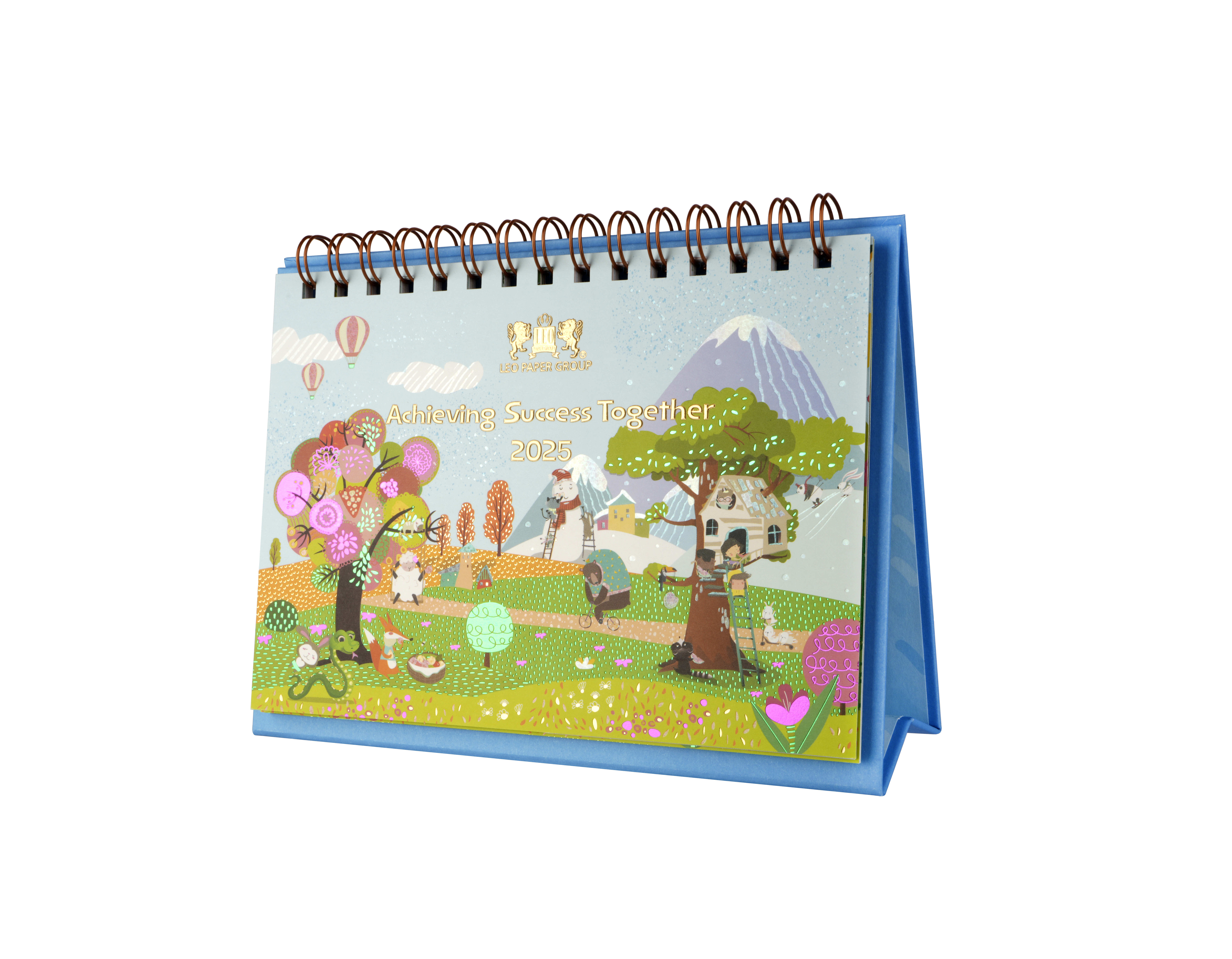 座枱曆以“Achieving Success Toget her”為主題,巧妙地將自然元素融入設計中。每一頁的插圖 都源自大自然的靈感,展現如樹屋、鞦韆等共同創建的愉悅場景 ,象徵著團隊合作與共同成長的美好願景。透過精緻的插畫與創 意設計,提醒人們在追求成功的旅程中,攜手並進,共同成長。 蛇曆以靈活的設計和生動的色彩,展現了蛇的優雅與智慧。 其可擺動的關節設計,不僅增添了互動性,更使得每一個月的展 示都充滿趣味。蛇的形象象徵著變化與成長,搭配精美的月曆頁 面,讓每個月都能激發出追求成功的動力。
