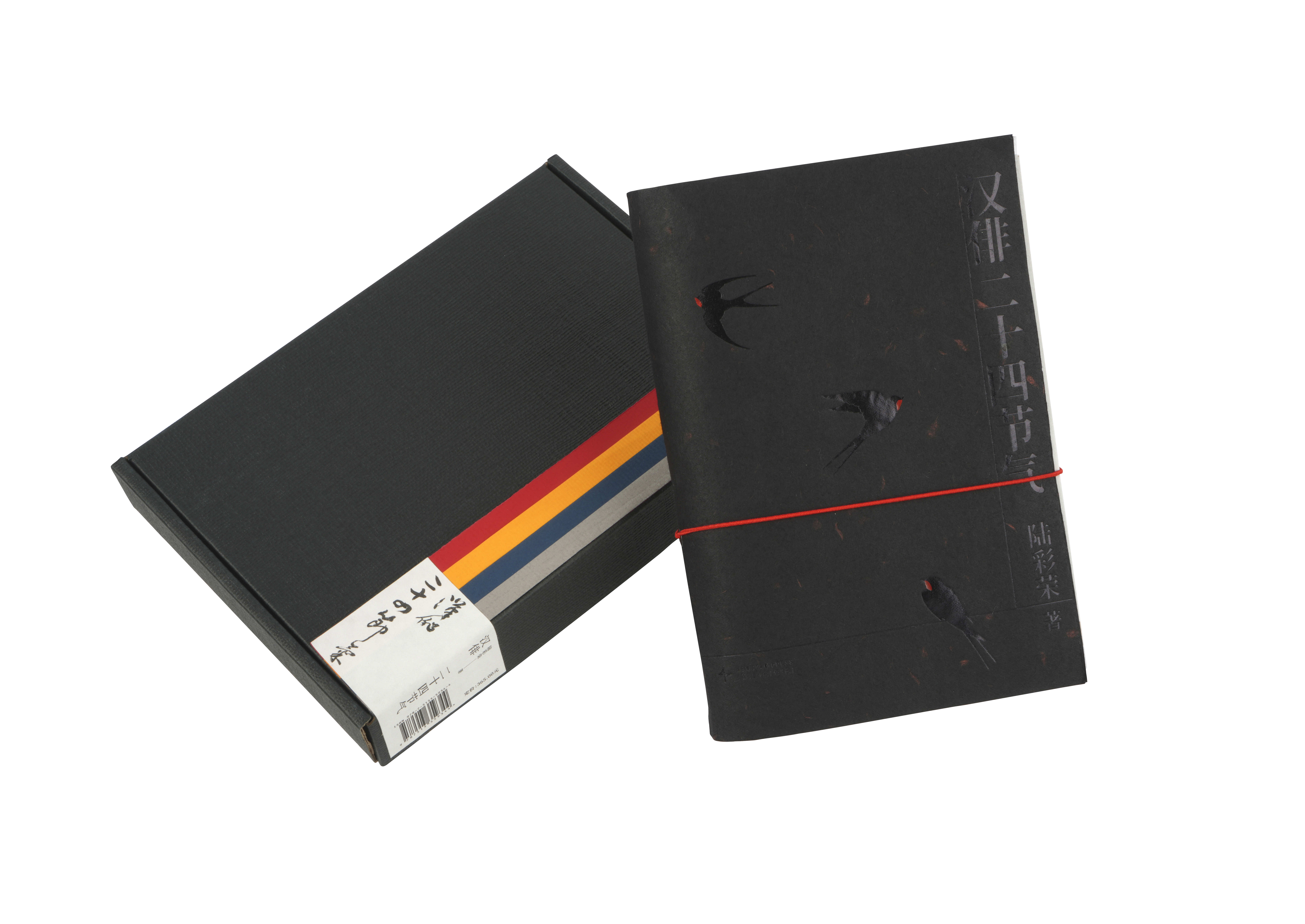 整體由飛機盒+函套+經折裝+裸脊裝構成,飛機盒面裱麻繩紙 和由內文紙構成的貼片;封面是由一張紙對折粘成的函套,燙紅 套燙黑的燕子象徵節氣迴圈的生命律動,書脊處打眼穿彈力繩, 一份由作者題詞的經折裝巧妙地卡在函套的插口內;內文四季對應四種顏色紙張,又用M形筒子頁間隔,書脊朝前口方向;整本 書握在手中宛若一本古典寶藏。